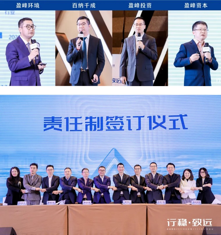 盈峰环境、百纳千成、盈峰资管则分别结合集团五年战略规划,就2022年的经营成果、2023年的战略目标进行了汇报,从反思问题出发,力求实现既定目标,助力集团高质量发展。随后,各成员单位负责人与集团董事长、总裁何剑锋签订2023年责任制目标,并与集团相关领导一起进行宣誓。各位带头人斗志昂扬,满怀信心,承诺以稳中求进的精神,共创美好未来。